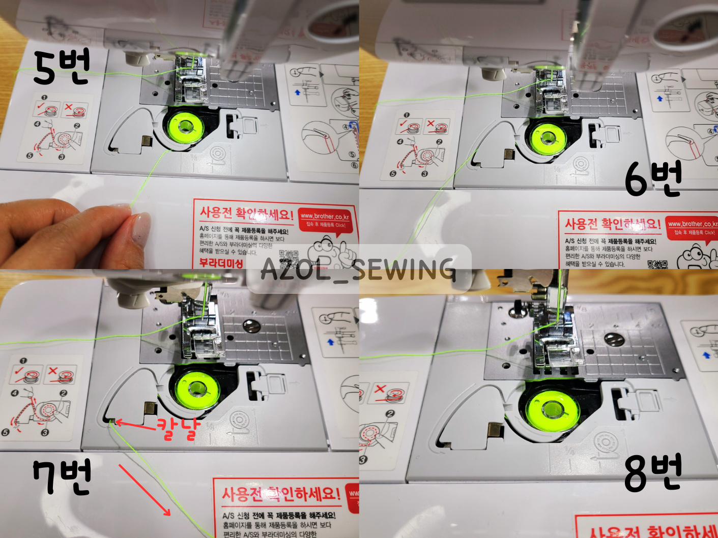 5번~6번 사진: 밑실을 재봉틀에 그려진 화살표 방향을 따라서 걸어주세요.