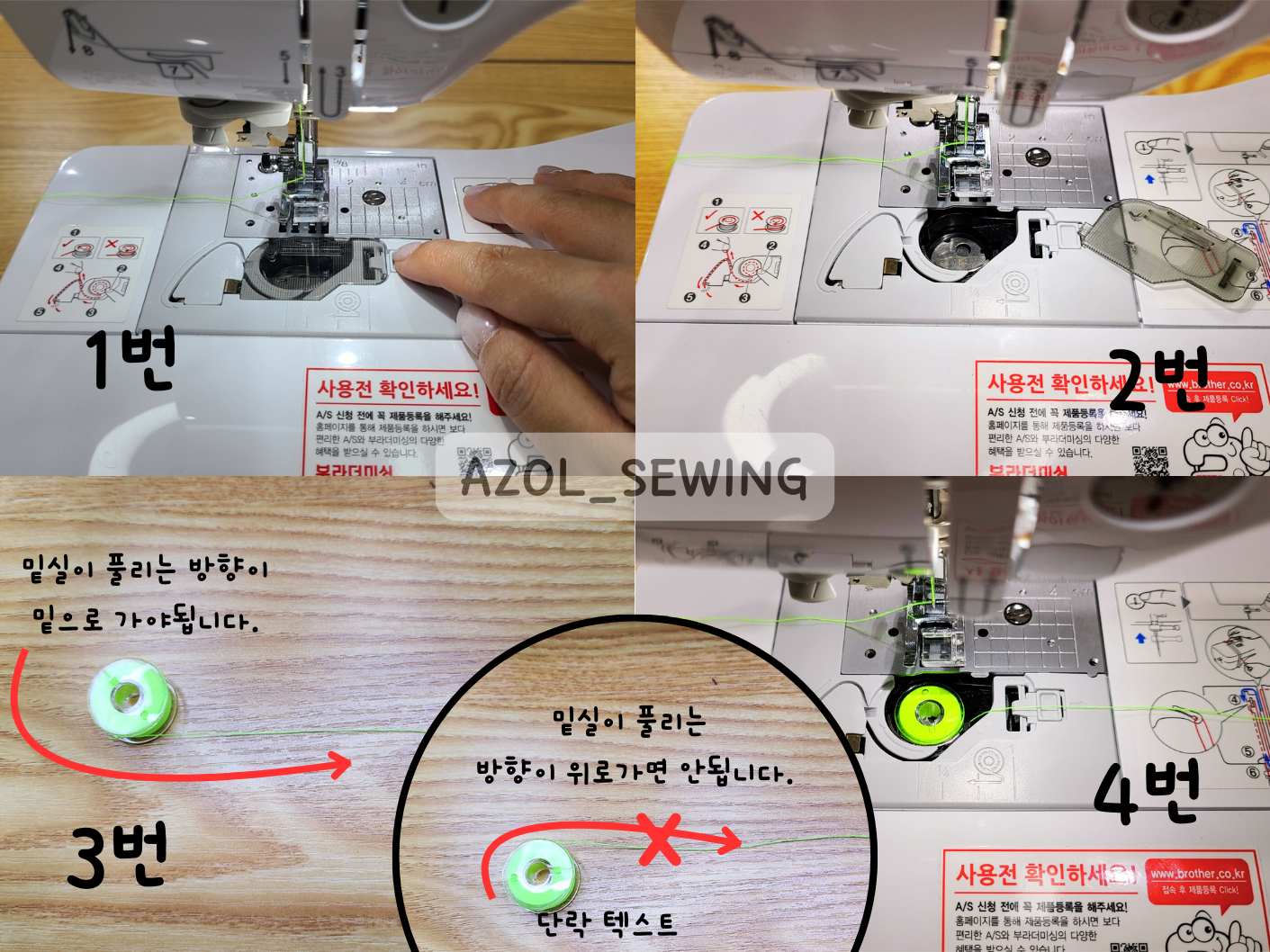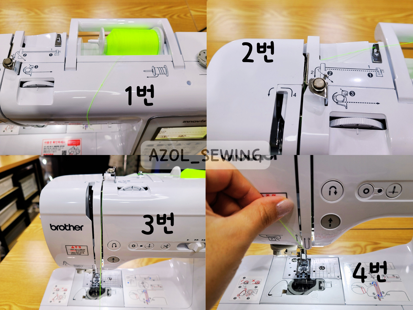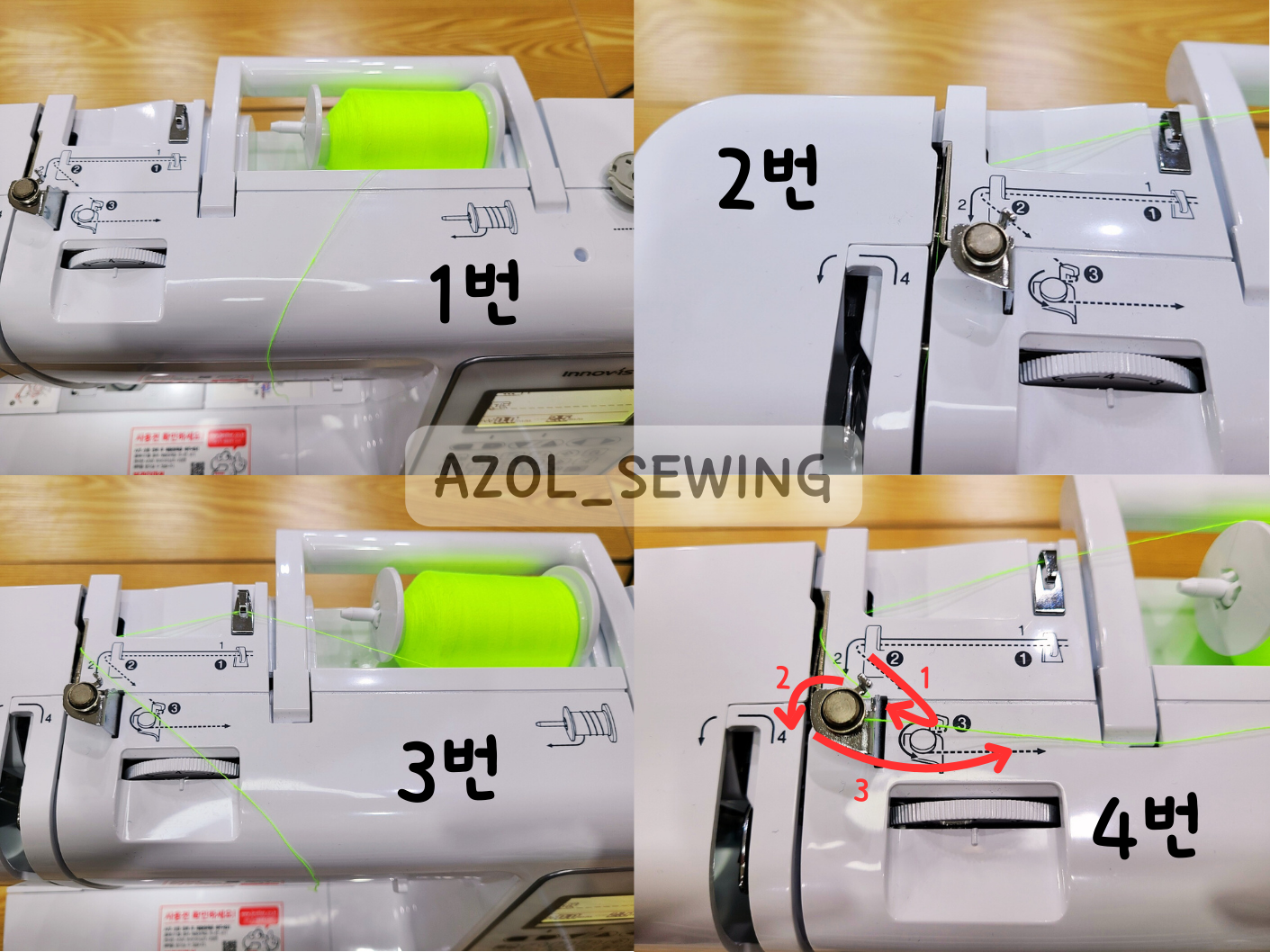 1번~4번 사진: 재봉틀에 재봉실을 걸고 실선을 따라 1~3을 가주세요.