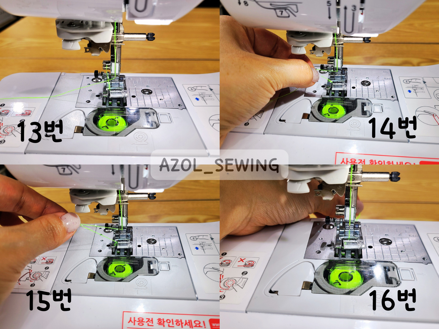 14번~16번 사진: 올라온 밑실과 바늘에 걸려있는 윗실을 같이 당겨서 모두 노루발 밑으로 보내주세요.