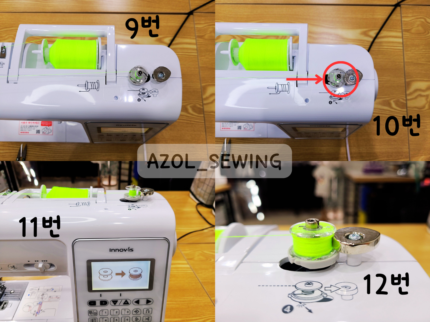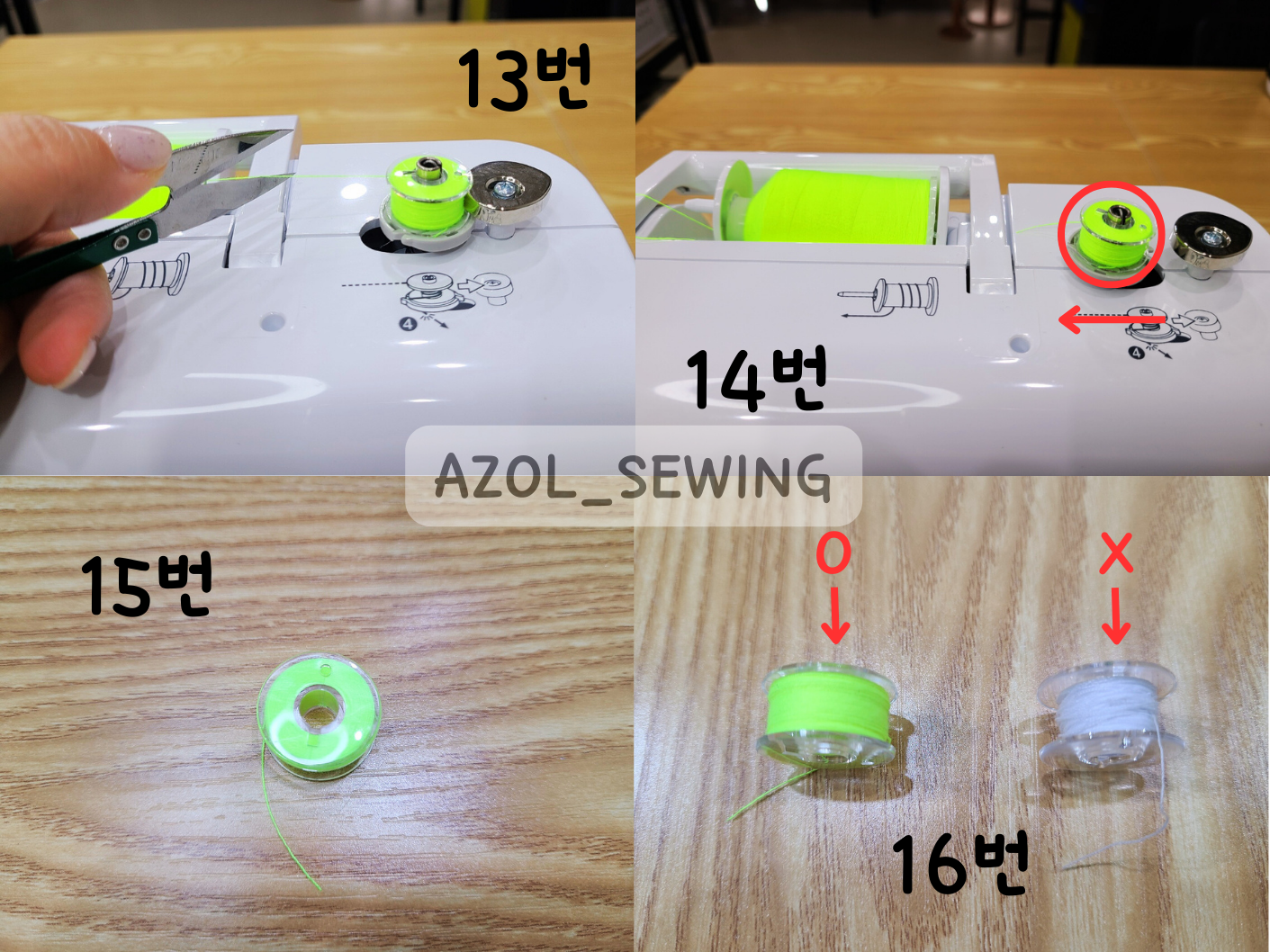 12번 사진: 오른쪽 쇠판에 밑실이 닿이면 뜨드득 하면서 밑실이 안감기는데 그때까지 감아주시면 되세요.